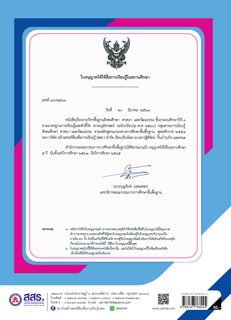 หนังสือเรียนรายวิชาพื้นฐาน สังคมศึกษา ศาสนาและวัฒนธรรม ชั้นประถมศึกษาปีที่ 1 (ฉบับใบอนุญาตฯ)